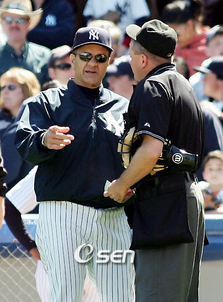 7일(한국시간) 뉴욕의 양키스타디움서 벌어진 뉴욕 양키스와 시애틀 매리너스의 경기 7회초 2사 후 양키스의 스캇 프록터가 시애틀 유니에스키 베탄코트에게 위협구를 던져 집단 몸싸움 일보 직전의 상황이 빚어진 뒤 양키스 조 토리 감독이 마이크 에버릿 구심에게 빈볼이 아니었다고 설명하고 있다. 이후 토리 감독은 언쟁 끝에 퇴장당했다./양키스타디움(뉴욕)=주지영 특파원 jj0@osen.co.kr