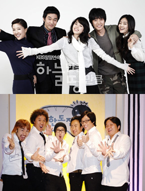 최근 지상파 3사의 강세 분야가 뒤바뀌고 있다. KBS는 예능에서 드라마 왕국으로 가는 분위기고, MBC는 그 반대의 현상을 보이는 중이다. SBS는 지지부진이다. 각 방송사별 시청률 추이를 살펴보면 이같은 현상이 뚜렷함을 알수 있다. TNS 미디어코리아가 5월 7일 발표한 ‘주간 시청률 상위 20위’조사에서 KBS는 드라마 부문이 단연 돋보였다. 1~3위를 싹쓸이했다. 먼저 일일 드라마‘하늘만큼 땅만큼’이 28.9%로 8주 연속 시청률 1위를 차지하는 기염을 토했다. 2위는 25.7%를 기록한 윤정희 주연의 주말극 '행복한 여자', 3위는 24.5%의 대하사극 '대조영'에게 돌아갔다. 특히 이들 세 드라마의 1~3순위는 4주째 고정돼 있다. KBS가 '드라마 왕국'으로 불리기에 부족함이 없는 기록이다. 반면 강세였던 KBS의 예능 프로는 주춤거리고 있다. 2TV ‘개그콘서트’가 MBC ‘무한도전’을 바짝 쫓아 9위를 기록한 것 외에는 ‘비타민’, ‘상상플러스’ 등 간판 예능프로들이 18, 19위를 기록하는 등 하락세가 뚜렷하다. MBC는 예능 프로에서 발군의 상승 기류를 이어가고 있다. 지난해 중반까지 고전을 면치 못하던 예능국은 최근 ‘무한도전’, ‘개그야’, ‘거침없이 하이킥’, ‘황금어장’ 등을 차례로 히트시키면서 활짝 웃는 중이다. '무한도전’은 18.7%로 전체 8위, 예능 1위를 차지했다. '일요일 일요일 밤에’와 ‘황금어장’ 각각 14, 16위로 좋은 분위기를 탔다. 대체로 드라마에 비해 예능 프로의 시청률이 떨어지는 경향에 비춰볼 때, 상당한 성적이다. 올 초 국민드라마‘주몽’, ‘하얀거탑’, ‘환상의 커플’등이 빠져나간 MBC는 드라마에서 별다른 재미를 못보고 있다. 일일극 ‘나쁜여자 착한여자’는 경쟁프로 KBS '하늘만큼 땅만큼'의 28.9%에 한참 뒤진 18.9%로 7위에 머무르고 있다. 이 외 주말극, 월화극 선두는 각각 KBS, SBS에 뺏긴 채 수목 드라마 ‘고맙습니다’만이 5위로 분발했다. 한편 SBS는 ‘예능왕국’이란 칭호가 무색할 정도로 침체해 있다. 교양프로 ‘긴급출동 SOS’가 종합 6위에 오르며 SBS 자체 최고 시청률을 기록한 게 위안거리다. 드라마 ‘내남자의 여자’, ‘연개소문’이 각각 4위와 10위를 기록한 것 외에 SBS 예능 프로그램은 순위에 오르지 못했다. 9pd@osen.co.kr