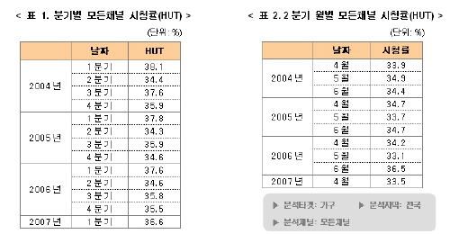 극장가에는 성수기와 비수기가 있다. 방학기간과 명절 연휴, 그리고 연말이 대표적인 성수기고, 그를 제외한 기간은 보통 비수기로 분류된다. 그럼 방송국에는 과연 성수기와 비수기가 있을까? 결과부터 밝히자면 비수기가 있다. 가장 날씨가 좋은 5월이 바로 그 시기다. 시청률 조사사회사 TNS미디어코리아가 지난 2004년부터 2006년까지 조사한 결과에 따르면 분기별로는 1분기(1월~3월) 시청률이 가장 높고, 2분기(4월~6월)가 가장 낮은 것으로 조사됐다.(표1 참고) 그리고 2분기 월별 시청률에서는 ‘가정의 달’ 5월이 가장 낮은 시청률을 기록한 것으로 나타났다. 2004년 5월에는 4월과 6월에 비해 높은 시청률을 기록했지만 이는 2004년 5월에 수도권 지역의 강수량이 평년에 비해 많았기 때문인 것으로 보인다. 이처럼 5월 TV시청률이 가장 낮은 이유로는 계절이 바뀌면서 야외활동이 가장 왕성하게 일어나기 때문이다. 화창한 날씨에 어린이날을 비롯한 주말 휴일에 집에서 TV만 보고 있는 사람들이 적다는 말이다. pharos@osen.co.kr 2004년 1분기부터 2006년 4분기 시청률(왼쪽)과 2분기 월별 시청률(오른쪽)./TNS미디어코리아 제공.