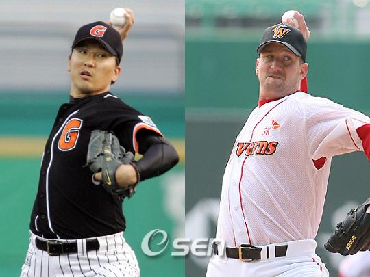 다승 1위 대 방어율 1위가 붙으면 누가 이길까? SK 제1선발 케니 레이번은 7일까지 5승 무패를 기록 중이다. 다승 공동 1위에 승률 100%다. 특히 홈구장 문학에선 5전 전승이다. 롯데 염종석은 7일까지 평균자책점 0.98을 기록하고 있다. 유일한 0점대 방어율이다. 3승 무패로 승률 역시 100%다. 문학 마운드에 올랐다 하면 승리를 따낸 레이번과 경기당 채 1실점도 하지 않은 염종석은 8일 선발 맞대결로 서로의 불패 영역에 도전한다. 다만 레이번은 5연승 와중에 전부 6이닝 이상을 투구했으나 갈수록 잘 맞은 타구수가 늘어나는 경향을 띠고 있다. 1위 SK는 팀 득점-팀 도루-팀 홈런에 있어 1위를 기록 중이다. 레이번의 5전승에 과정에서도 SK타선의 활발한 득점 지원 덕이 매우 컸다. 반면 3위 롯데는 3.12로 팀 평균자책점 1위다. 염종석에 이어 최대성-임경완-카브레라 등 불펜진이 대기하고 있다. 여기에 SK에 비해 전체적 타선 짜임새는 떨어지지만 이대호라는 일당백 타자를 보유하고 있다. 공수에 걸쳐 전반적으로 SK 라인업이 우세를 보이지만 '롯데의 10번타자'인 열혈 응원단이 문학구장에 대거 몰려 분위기를 잡는다면 흐름은 예측불허다. 김성근 SK 감독과 강병철 롯데 감독의 자존심 싸움도 볼거리다. sgoi@osen.co.kr 염종석-레이번.