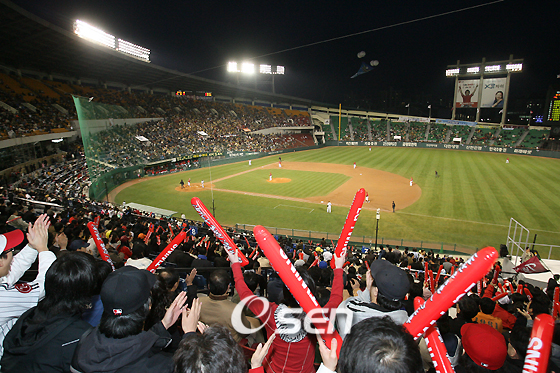 올 시즌 400만 관중 재돌파를 기대하고 있는 한국 프로야구가 10년 만에 최소경기 100만 관중 돌파로 목표 달성 전망을 밝게 하고 있다. 13일 현재 전체 일정의 24%인 121경기가 거행된 2007 삼성 PAVV 프로야구에 총 104만 4482 명의 관중이 입장, 올 시즌 목표인 400만 관중을 향해 순조로운 출발을 보이고 있다. 총 504경기를 거행하는 2007 프로야구는 13일 총 4만 6487명의 관중이 입장해 2년 연속 300만 관중 이상을 기록하였던 지난해의 137경기보다 16경기가 빠른 121경기 만에 100만 관중을 돌파했다. 390만 관중을 기록했던 1997년(98경기) 이후 최소 경기 만에 100만 관중을 넘어섰다. 올 시즌 프로야구 관중은 역대 처음으로 평일 저녁 개막전을 가진 지난 4월 6일 총 5만 25명이 입장하고 전년도 하위 팀들의 개막 경기였던 4월 10일에는 비로 한 경기가 연기되었음에도 불구하고 사직경기가 매진되는 등 3경기에 총 5만 4454명이 입장했다. 어린이날인 지난 5일에는 올 시즌 최다인 7만 1993명이 야구장을 찾아 프로야구에 대한 뜨거운 열기를 예감할 수 있게 하였다. 2007년 프로야구는 지난해 투타 3관왕을 기록했던 류현진(한화) 이대호(롯데)의 변함없는 활약과 이에 도전하는 양준혁(삼성) 이숭용(현대) 등 노장 선수들의 맹활약, 그리고 외국인 선수들이 제 몫을 다해 주면서 더욱 공격적이고 화끈한 경기를 선보여 팬들의 주목을 끌고 있다. 또한 해외에서 활약했던 선수들의 복귀와 치열한 구원 투수 경쟁 등 더욱 높아진 마운드로 전력이 평준화되어 선두와 최하위의 승차가 불과 6.5경기 밖에 되지 않는 유례없는 대혼전 양상을 보이고 있어 구름 관중을 야구장으로 끌어 들이고 있다. 13일 현재 프로야구 총관중 104만 4482명은 2006년 동일 경기수 입장 관중 92만 186명보다 12만 4296명이 늘어나 14%의 높은 증가율을 보이고 있고 경기당 평균관중은 7605명에서 8632명으로 1027명이 늘어났다. 작년에 비해 관중 증가율이 가장 두드러진 팀은 LG 트윈스로 43%가 늘었고 현대 유니콘스가 11%로 그 뒤를 잇고 있다. 전체 관중수로는 LG 트윈스가 22만 1312명(13G)으로 가장 많고 롯데 자이언츠 21만 9531명(15G), 두산 베어스 20만 4354명(16G), SK 와이번스 13만 9113명(16G)순이며 경기당 평균 관중 역시 1만7024명을 기록한 LG가 가장 많다. 지난해 잦은 황사와 장마로 인한 악조건 속에서도 풍성한 대기록과 이벤트 강화 등으로 2년 연속 300만 관중을 이어간 프로야구는 개막 전 구장 시설 현대화와 구단별 다양한 이벤트를 시작으로 대대적인 어린이회원 모집으로 관중 유치에 노력하고 있으며, 우수한 신인선수의 입단과 해외진출 선수의 복귀, 스트라이크존 축소와 공인구 반발력 증가로 어느 해 보다 박진감 넘치는 경기가 진행되고 있어 복중기간 서머리그로 인기를 이어간다면 지난 1996년 449만 8082명이 입장한 이후 11년 만에 400만 관중 돌파가 이루어질 전망이다. 한편 페넌트레이스 최다관중을 기록한 해는 1995년으로 540만 6374명이 입장했다. 또한 올 시즌 프로야구 관중 유치 목표는 총 404만 9600명(평균 8035명)이고 현재의 평균관중(8632명)으로 환산하면 페넌트레이스 종료 후 435만 528명이 예상된다.. 지난달 6일 LG와 KIA의 개막전이 열린 잠실구장.