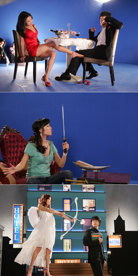 당찬 여자들의 도발이 시작됐다. SBS TV 새 주말 특별기획 ‘불량커플’(최순식 극본, 이명우 연출)에 출연하는 당돌한 여인들의, 눈에 띄는 개성 연출로 드라마 포스터 촬영장 분위기부터가 심상치 않았다는 소식이 있다. 이 드라마에 출연하는 기 센 여인들은 김당자 역의 신은경, 나돌순 역의 변정수, 그리고 유부남 박상민의 애인 역을 맡은 채민서 등이다. 이들은 드라마의 얼굴이 될 포스터 촬영에서부터 ‘강한 여인’의 기운을 불어넣기 위해 이미지를 사리지 않는 과감한 표현으로 현장 스태프를 놀라게 했다고 한다. 먼저 눈길을 끄는 사진은 박상민과 채민서의 레스토랑 식사 장면. 조신한 가정주부 현영(최정윤 분)의 남편인 박상민과 그의 애인 채민서가 테이블을 가운데 두고 나란히 앉았다. 미끈한 다리가 훤히 드러나는 고혹적인 진홍색 초미니 원피스를 입은 채민서가 테이블 아래로 다리를 뻗어 박상민을 유혹하고 있고 박상민은 난감한 상황에 어찌해야 할 지 모르는 표정을 짓고 있다. 채민서가 신발을 신은 채 자신의 다리를 간질이자 박상민이 “좀더 찌릿찌릿한 감정을 느끼려면 신발을 벗고 하는 게 어떻겠느냐”고 즉석에서 제안해 이 장면이 연출됐다고 한다. 나돌순으로 나오는 변정수가 칼에 물을 뿌리고 있는 장면도 눈길을 끈다. 나돌순은 남편인 조용구(김하균 분)에게 분을 품고 긴 칼을 숫돌에 가는가 하면 남편을 노려보며 칼을 던지는 엽기적인 폭소 장면을 연출했다. 여기서 변정수의 기지가 또 동원됐다. “칼에는 물을 뿌려야 제 맛이 아니겠느냐”며 콘티에도 없는 장면을 집어 넣었다. 날카로운 칼을 들고 입에다 머금은 물을 뿌리고 있는 장면은 이렇게 해서 만들어졌다. 주인공인 신은경과 류수영의 포스터는 ‘사랑의 신’이 컨셉트다. 결혼은 싫은데 아이는 갖고 싶은 신은경은 식물학과 교수인 최기찬(류수영 분)의 최고급 유전자를 얻기 위해 그의 육체를 꼬드기는 설정으로 극 초반을 달군다. 사랑의 신 큐피드와 그 화살을 맞게 되는 남자와 상황이 맞아 떨어진다. 이 장면을 위해 신은경은 날개 옷이 달린 천사 복장을 하고 사랑의 화살을 잡아 당기는 장면을 연출했다. 고소영 박정철 주연의 ‘푸른 물고기’ 후속으로 준비되고 있는 ‘불량커플’은 6월 2일 첫 방송 되는 코믹극이다. 100c@osen.co.kr 위에서부터 레스토랑을 배경으로 야릇한 장면을 연출한 채민서-박상민 커플, 칼에 물을 뿌리고 있는 변정수, 큐피드로 변신한 신은경과 류수영 커플의 타이틀 컷.