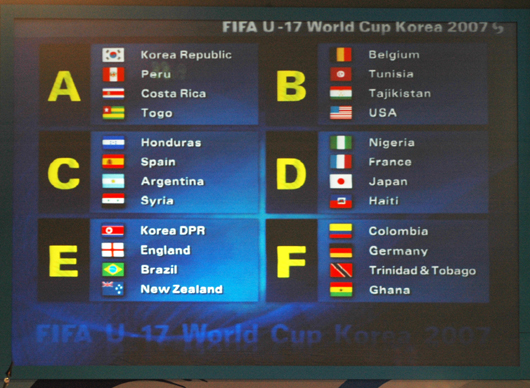 박경훈 감독이 이끄는 17세 이하 청소년 대표팀이 페루, 코스타리카, 토고와 함께 A조에 속해 16강 진출에 파란불이 켜졌다. 한국은 17일 서울 한남동 그랜드 하얏트 호텔 그랜드 볼룸에서 열린 2007 국제축구연맹(FIFA) 17세 이하 청소년 월드컵 조 추첨식에서 남미의 페루, 북중미의 코스타리카, 아프리카의 토고와 A조에 편성돼 유럽의 강호들을 모두 피해갔다. 페루는 지난 2005년 자국에서 열렸던 대회에 처음 출전했지만 1득점, 4실점을 기록하고 1무 2패로 물러난 팀. 당시 페루는 코스타리카, 중국, 가나와 같은 조에 속해 가나와만 1-1로 비겼을 뿐 중국과 코스타리카에 0-1, 0-2로 패한바 있다. 페루와 2개 대회 연속 만난 코스타리카는 6번 17세 이하 월드컵에 출전해 지난 2001년과 2005년 6위를 차지했다. 코스타리카는 지난 2005년 페루 대회에서 1승 2무를 기록, 중국에 골득실에 앞서 A조 1위를 차지해 8강에 올랐으나 멕시코에 1-3으로 져 4강 진출에 실패했다. 또 2006 독일 월드컵에 이어 또 다시 국제 무대에서 격돌한 토고는 이번 대회가 첫 출전. 그러나 아프리카축구연맹(CAF) 예선전에서 남아프리카공화국, 튀니지, 가봉과 A조에 속해 2승 1패로 4강에 오른 뒤 가나를 2-1로 꺾는 파란을 일으키며 결승까지 올랐다. 또 결승에서도 나이지리아와 연장까지 가는 접전 끝에 0-1로 아쉽게 지며 준우승에 그치는 성적을 보여줬다. 하지만 토고가 독일 월드컵 지역예선에서도 놀라운 성적을 거두고 올라왔지만 정작 본선에서는 3패로 물러났듯이 국제무대 첫 경험이어서 한국이 충분히 승리할 것으로 예상된다. 특히 24개팀이 겨루고 16개팀이 토너먼트로 올라가기 때문에 첫 경기에서 페루를 잡을 경우 최소한 와일드카드 자격으로 16강에 오를 것으로 예상된다. 한편 한국이 A조 1위를 차지할 경우 C,D,E조 와일드카드 팀과 8강진출을 놓고 격돌하고 A조 2위일 경우 C조 2위팀과 만나게 된다. A조 3위 와일드카드로 16강에 오르게 된다면 B조 1위나 C조 1위팀과 8강행을 놓고 만나게 돼 다소 어려움이 예상된다. 반면 북한은 잉글랜드, 브라질, 뉴질랜드와 E조에 속해 와일드카드를 노려야 할 것으로 보이고 일본도 나이지리아, 프랑스, 아이티와 함께 D조에 편성돼 다소 어려움이 예상된다. 또 F조에는 독일, 가나, 트리니다드 토바고, 콜롬비아가 속해 '죽음의 조'로 평가됐다. tankpark@osen.co.kr