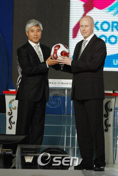 17세 이하 한국 청소년 대표팀을 이끌고 있는 박경훈 감독이 자신이 전날 밤 꾼 길몽이 현실이 되자 환한 미소를 지었다. 박 감독은 17일 서울 한남동 그랜드 하얏트 호텔 그랜드볼룸에서 열린 2007 국제축구연맹(FIFA) 17세 이하 청소년 월드컵 조 추첨식에서 진행자와 가진 인터뷰에서 "공인구를 받아드니 가슴이 벅차고 이제 시작이라는 생각이 든다"며 "조 추첨은 좋은 성적을 거두는데 있어 가장 중요한 부분이며 전날 밤 길몽을 꿨기 때문에 좋은 편성이 나올 것 같다"고 밝혔다. 이어 꿈의 내용에 대해 묻자 박 감독은 "좀처럼 꿈을 꾸지 않는데 어둠에서 빛이 내려오는 내용이었다"고 덧붙였다. 이를 지켜본 일부 기자들은 "길몽은 얘기하면 오히려 부정탄다는데"라는 얘기를 주고 받았지만 정작 조 추첨결과 코스타리카, 페루, 토고 등 해볼만한 상대와 A조에 편성되자 "길몽이 현실이 됐다"며 만면에 웃음을 띠었다. ◆ 서울-서귀포만 월드컵 경기장서 개최 오는 8월 18일부터 9월 9일까지 열리는 17세 이하 월드컵의 경기 장소 가운데 월드컵 경기장은 서울 상암 월드컵 경기장과 제주 서귀포 월드컵 경기장 두 군데인 것으로 밝혀졌다. 17세 이하 청소년 월드컵 조직위원회에 따르면 3~4위전과 결승전이 열리는 서울과 B조 조별리그 4경기 등을 여는 제주 서귀포를 제외한 수원, 울산은 모두 종합운동장에서 열린다고 밝혔다. 이에 따라 수원에서 두차례 조별리그를 벌이는 한국은 8월 18일 오후 8시에 열리는 페루와의 첫 경기과 8월 21일 오후 8시에 열리는 코스타리카와의 두번째 경기를 모두 수원 월드컵 경기장이 아닌 송죽동 수원 종합운동장에서 열린다. 또 토고와의 마지막 조별리그 경기도 울산 문수 월드컵 경기장이 아닌 울산 종합운동장에서 개최된다. 한편 월드컵 경기장이 없는 고양과 천안, 창원도 종합운동장에서 열리며 광양 경기는 전남의 홈구장인 광양전용구장에서 벌어진다. tankpark@osen.co.kr 박경훈 감독이 아디다스 코리아 측으로부터 이번 대회 공인구를 넘겨 받고 있다.