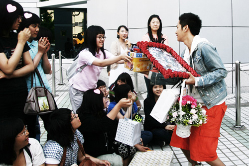 장근석이 잊지 못할 ‘성년의 날’ 선물을 받았다. 올해 만 스무살이 되는 장근석은 성년의 날에 받아야 할 선물 세 가지, 즉 장미꽃과 향수 그리고 키스를 받고 어쩔 줄 몰라 했다. 그도 그럴 것이 장근석에게 평생 잊지 못할 선물을 준 주인공이 바로 다섯 살 꼬마팬이었기 때문이다. 장근석은 지난 5월 20일이 ‘SBS 인기가요’를 진행하고 난 뒤 팬들이 열어준 깜짝 성인식에 참석했다. 장근석의 팬들이 소속사도 모르게 준비한 파티였다. 그리고 장근석에게 선물을 전달하는 행운을 거머쥔 주인공이 바로 다섯 살 난 꼬마팬이었다. 이날 행사에서 팬들은 분홍색 하트를 머리에 달고 등장해 장근석에 대한 애정을 표시했고 장근석 또한 장미꽃 한 송이씩을 선물하며 팬 사랑에 화답했다는 소식이다. 장근석은 최근 영화 ‘즐거운 인생’으로 꽃미남 이미지를 벗고 성인연기자로의 변신을 도모하고 있다. 100c@osen.co.kr 팬들이 열어준 깜짝 성인식을 즐기고 있는 장근석(맨 오른쪽). /루브엔터테인먼트 제공.