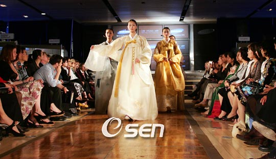 미국 스미스소니언 자연사 박물관 내 한국관 개관을 축하하는 한복 디자이너 이영희씨(71)의 '2007 뉴욕 콜렉션' 패션쇼가 20일에 이어 23일(한국시간) 뉴욕 맨하튼의 타임워너센터 삼성익스피리언스에서 '한지로 다시 태어난 바람의 옷!'이란 주제로 열렸다. 한복의 미를 한껏 드러낸 모델들이 사뿐사뿐 무대를 걷고 있다./뉴욕-주지영 특파원jj0jj0@osen.co.kr