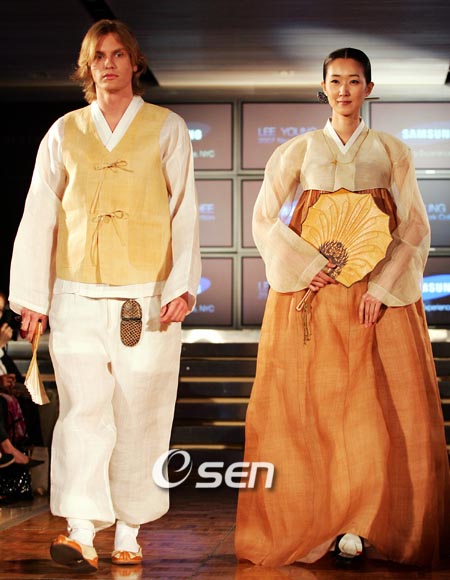 미국 스미스소니언 자연사 박물관 내 한국관 개관을 축하하는 한복 디자이너 이영희씨(71)의 '2007 뉴욕 콜렉션' 패션쇼가 20일에 이어 23일(한국시간) 뉴욕 맨하튼의 타임워너센터 삼성익스피리언스에서 '한지로 다시 태어난 바람의 옷!'이란 주제로 열렸다. 금발의 외국인 남성과 한국 여성 모델이 위를 시원하게 이겨낼수 있는 모시를 소재로 한 편안한 개량 복을 선보이고 있다./뉴욕-주지영 특파원jj0jj0@osen.co.kr