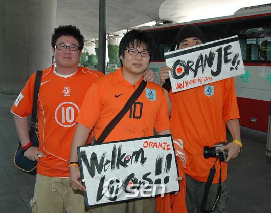 '간밤에 잠을 한 숨도 못잤어요'. 30일 인천 국제 공항 B도착구에는 오렌지 색의 유니폼을 입은 한 무리의 사람들이 모여있었다. 저마다 가슴에는 네덜란드 왕실의 상징인 사자 문양을 박은 이들의 등에는 축구팬들에게 친숙한 '베르캄프', '반 데 바르트' 등의 이름이 박혀 있었다. 바로 이 날 입국하는 네덜란드 대표팀을 기다리는 팬들이었다. 그리 많은 수는 아니었지만 약 30여 명의 축구팬들은 선수들 도착 1~2시간 전부터 속속 모여들었다. 이들은 네덜란드 대표팀의 유니폼과 함께 손에는 사인을 받을 각종 기념품들이 들려져 있었다. 경기도 안산시에서 인천 공항으로 왔다는 홍유석(26, 대학생)씨는 "간밤에 잠을 자지 못했다. TV에서만 보던 스타들을 만나려하니 마음이 설레었기 때문이다" 며 흥분감을 감추지 못했다. 그는 "친구들과 함께 왔는데 좋은 경기를 펼치고 갔으면 좋겠다" 며 "경기에서는 사이좋게 비겼으면 좋겠다" 고 말하기도 했다. 이들은 네덜란드 대표팀이 나오자 환호성과 박수로 환영했다. 이에 네덜란드 선수들도 손을 들어 화답했으며 팬들의 사인 공세에 싫어하는 기색없이 정성껏 응해주는 프로다운 모습도 보였다. 리버풀에서 뛰고 있는 더크 카이트는 "열렬한 환영을 보내준 팬들에게 감사한다" 며 말하기도 했다. bbadagun@osen.co.kr
