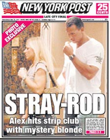 [OSEN=세인트피터스버그, 김형태 특파원] '유부남' 알렉스 로드리게스(32.뉴욕 양키스)가 원정 경기 도중 묘령의 여인과 스트립클럽에 출입하다 적발돼 망신살이 뻗쳤다. 는 31일(이하 한국시간) 지난 28일 토론토 원정 경기를 마친 로드리게스가 금발의 여인과 저녁 식사 후 스트립클럽에 출입한 사실을 보도했다. 이들은 선수단 숙소인 파크 하얏트를 벗어나 인근 포시즌스호텔에서 저녁을 함께 한 뒤 토론토 시내의 스트립클럽으로 향했다고 한다. 타블로이드 신문 뉴욕포스트는 이 사실을 전하면서 스포츠면 1면에 'STRAY-Rod(딴짓-로드)'라는 대문짝 만한 헤드라인을 게재했다. 로드리게스는 와이프 신시아와의 사이에 2살 반 된 딸 나타샤를 두고 있다. 그러나 그와 함께 '토론토에서 하룻밤'을 보낸 인물은 신원을 알 수 없는 젊은 여인으로만 알려졌다. 사건이 크게 보도되자 양키스 출입 기자들은 로드리게스를 붙잡고 이 사건을 캐묻기 시작했다. 그러나 로드리게스는 "사생활에 관해서는 당연히 노코멘트다. 우리 팀은 물론 나 자신에게도 큰 문제가 되지 않을 것"이라고 말했다. 조 토리 감독은 "뉴욕에서는 야구 외에 수많은 화제거리가 있다"면서 "내가 처음 양키스 감독직에 부임했을 때 그저 타격과 러닝, 투수 교체에 관해서만 얘기가 오가지는 않을 것이란 걸 알았다"고 말해 언론의 엉뚱한 관심사가 당연하다는 반응을 보였다. 하지만 그는 "알렉스는 성인이다. 야구를 매우 심각하게 대하고 있다"면서 "오늘밤 경기에 출장하지 않는 한 그 사건은 큰 문제가 아니다"고 대수롭지 않게 말했다. 양키스는 이날 현재 승률 4할2푼(21승29패)로 탬파베이 데블레이스와 함께 아메리칸리그 동부지구 최하위에 처져 있다. 1위 보스턴 레드삭스와는 무려 14.5경기차. workhorse@osen.co.kr 뉴욕포스트
