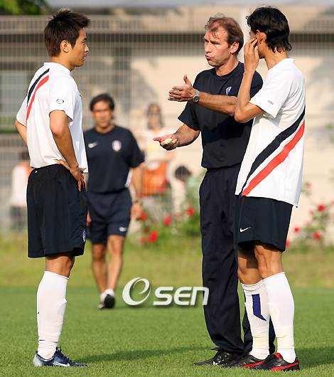오는 6월 2일 네덜란드와 평가전을 갖는 태극전사들이 31일 낮 서울 홍은동 그랜드 힐튼 호텔에 소집돼 상암 보조경기장에서 훈련에 들어갔다. 전날 경기를 치른 선수들은 간단한 러닝으로 회복 훈련을 실시했고 나머지 선수들은 강도 높은 훈련을 소화했다. 핌 베어벡 감독이 스트라이커인 이동국과 우성용에게 전술을 설명하고 있다./손용호 기자spjj@osen.co.kr