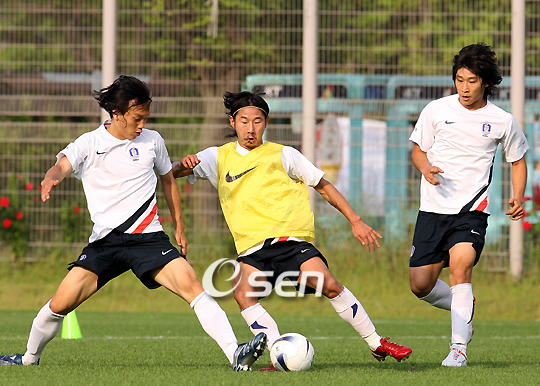 오는 6월 2일 네덜란드와 평가전을 갖는 태극전사들이 31일 낮 서울 홍은동 그랜드 힐튼 호텔에 소집돼 상암 보조경기장에서 훈련에 들어갔다. 전날 경기를 치른 선수들은 간단한 러닝으로 회복 훈련을 실시했고 나머지 선수들은 강도 높은 훈련을 소화했다. 미니게임서 이천수가 이근호와 김치우(왼쪽) 사이에서 공을 컨트롤하고 있다./손용호 기자spjj@osen.co.kr