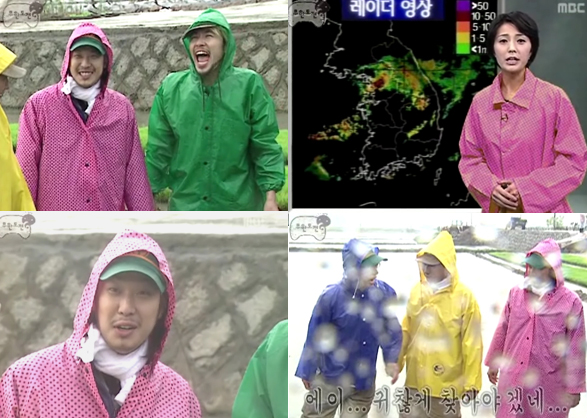 하하가 MBC 인기 예능프로 '무한도전'에서 교제중인 기상 캐스터 안혜경과의 커플 우의 '애정 과시'로 화제를 모았다. 2일 ‘무한도전-모내기편’은 무한도전 6명의 고정 출연진이 모내기철 농촌을 찾아가 진행됐다. 장대비가 줄기차게 퍼붓는데다 바람까지 거세게 부는 등 악천후로 당초 준비했던 진행이 힘들었던 상황. 그럼에도 출연진은 이날 방송의 의의를 살려 나란히 서서 모를 심는 도전(?)만큼은 감행했다. 각자 준비한 우의를 입고 논으로 들어가 모내기를 준비하는 순간, 유재석이 하하의 분홍빛 우의를 보면서 일침을 가한 것. "남자 우의가 아니다. 누구껄 빌려입고 나온지 알겠다"고 하하를 놀리자 하하는 부끄러움에 얼굴이 핑크빛으로 물들었다. '무한도전' 제작진이 이같은 호재를 그냥 지나칠리 만무하다. 이어서 화면에는 안혜경이 비슷한 컬러와 스타일의 우의를 입고 일기예보하는 장면을 내보냈고 시청자를 위한 해설 자막까지 덧붙였다. 옆에서 지켜보던 노홍철과 정형돈 등이 기다렸다는 듯 하하를 놀렸지만 하하는 커플 우의를 부정하지 않고 두 사람의 탄탄한 애정을 과시했다. 맏형격인 거성 박명수는 이를 조용히 지켜보다가 "나도 결혼하고 싶다"는 한탄을 해 스태프와 출연진을 다시 한번 웃겼다. 이날 출연진의 온 몸을 던져 펼친 몸개그로 시청자게시판 등에서 호평을 받았던 '무한도전'은 AGB 닐슨 미디어 리서치 조사 결과 전국 시청률 14%를 기록, 경쟁 프로인 SBS ‘작렬! 정신통일’ 8.2%, KBS 2TV ‘스펀지’ 7.2% 를 따돌렸다. mcgwire@osen.co.kr MBC '무한도전' 화면 캡쳐