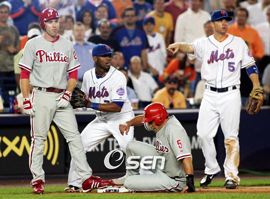 6일(한국시간) 뉴욕의 셰이 스타디움에서 벌어진 뉴욕 메츠와 필라델피아 필리스의 경기 필라델피아의 6회초 1사 1,2루서 애런 로원드의 짧은 우전 안타 때 2루주자 체이스 어틀리(왼쪽)가 3루를 돈 뒤 홈 질주를 포기하는 사이 1루주자 팻 버렐이 2루를 지나 3루까지 내달려 둘이 나란히 3루를 밟았다. 이에 메츠 유격수 호세 레예스가 둘다 태그한 뒤 타자주자 로원드가 2루로 달리는 방향을 바라보고 있는 사이 3루수 라이트가 어틀리도 아웃이라는 제스처를 취하고 있다. 룰에 따라 3루 점유권을 갖고 있던 어틀리는 세이프가 됐다./ 셰이스타디움(뉴욕)=주지영 특파원 jj0jj0@osen.co.kr