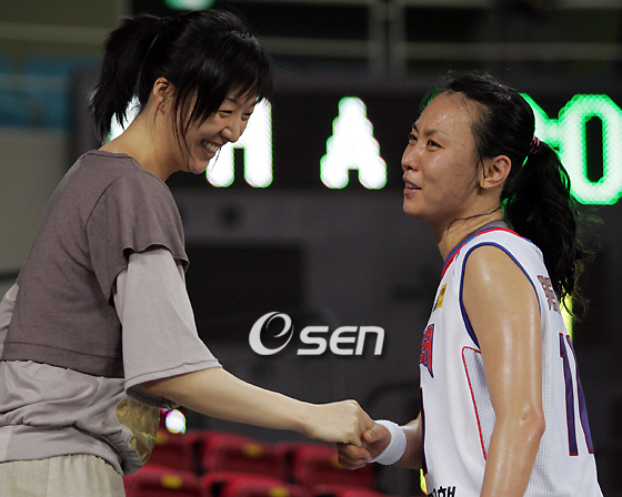 제22회 FIBA 아시아 여자농구 선수권대회 겸 2008 베이징 올림픽 예선대회 5차전 한국과 중국의 경기가 7일 오후 인천 삼산월드 체육관에서 열렸다. 변연하가 경기가 끝난 뒤 관중석으로 올라가 부상서 재활 중인 삼성생명 선배인 전 국가대표 이미선과 반갑게 악수를 나누고 있다. 한국이 83-80으로 승리했다./인천=황세준 기자 storkjoon@osen.co.kr