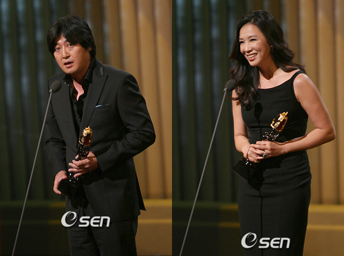 영화 ‘타짜’의 김윤석과 ‘국경의 남쪽’의 심혜진이 제 44회 대종상 영화제 시상식에서 각각 남녀조연상을 수상했다. 6월 8일 저녁 8시 50분 서울 세종문화회관 대강당에서 열린 44회 대종상 영화제 시상식에서 남우조연상을 수상한 김윤석은 “쟁쟁한 분들과 함께 자리해 선 것만으로 영광스러운데 이렇게 상을 받게 돼 감사하다. ‘타짜’의 아귀로 알려지기 전까지 아귀 역에 내가 캐스팅될 것이라고는 아무도 짐작 못했다. 나의 악마성을 발견하고 캐스팅해주신 최동훈 감독님께 감사드린다”고 소감을 밝혔으며 3년 만에 스크린에 복귀한 심혜진은 “깜짝 놀랐다. ‘국경의 남쪽’에 함께 출연한 조이진씨에 이어 내가 상을 받게 돼 놀랍다. 기쁘지만 상을 받으니까 겸허해지는 마음이 생긴다. 더 열심히 노력하겠다”고 감격스러움을 감추지 못했다. 남우조연상에는 ‘타짜’의 김윤석을 비롯해 ‘짝패’의 이범수, ‘각설탕’의 유오성, ‘괴물’의 변희봉, ‘비열한 거리’의 천호진, 여우조연상에는 ‘국경의 남쪽’의 심혜진을 비롯해 ‘가족의 탄생’의 김혜옥, ‘괴물’의 고아성, ‘우아한 세계’의 박지영, ‘올드미스 다이어리’의 김영옥이 후보로 올랐다. hellow0827@osen.co.kr