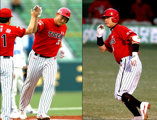 솜방망이의 수모를 겪어온 KIA 타선이 올 들어 최다인 22안타를 폭발했다. 돌아온 선발 김진우(23)는 화끈한 타선 지원을 받아 첫 승의 기쁨을 누렸다. KIA는 14일 대구 삼성전에서 김주형과 손지환의 연타석포 등 장단 22안타를 터트리고 11-5 대승을 거두었다. 연승을 거둔 KIA는 24승1무33패로 승패 적자폭을 9로 줄였다. KIA는 지난 주말 SK, 이번 주중 삼성과의 3연전에서 각각 2승 1패를 거두고 상승곡선을 긋기 시작했다. 연패를 당한 삼성은 26승3무26패로 승률 5할로 밀려났다. KIA 공격 주역은 단연 김주형과 손지환. 만년 후보였던 두 타자는 각각 연타석 홈런을 날리며 5타점과 6타점 등 팀의 11타점을 모두 합작했다. 다른 선수들은 두 타자 앞에 찬스만 만들어주면 됐다. KIA는 시즌 최다안타를 쳤고 삼성은 최다피안타의 수모를 당했다. 전날 결승 투런홈런을 날린 김주형은 1회초 톱타자 이현곤의 2루타와 손지환의 희생플라이로 1-0으로 앞선 2사 1,3루에서 삼성 선발 매존의 바깥쪽 낮은 직구를 걷어올려 125m짜리 3점 장외홈런을 날렸다. 이어 4-0으로 앞선 3회초 선두타자 송산이 안타로 출루하자 바뀐 투수 임동규를 상대로 똑같은 코스로 투런 장외홈런을 날렸다. 김주형이 화끈하게 터지자 손지환의 방망이에서도 불이 났다. 6-0으로 승기를 잡은 4회초 좌월 장외 솔로홈런으로 한 점을 보탠 손지환은 5회초 1사2,3루에서 좌월 3점홈런을 날려 삼성을 그로기 상태로 몰아넣었다. 손지환은 7회초 무사 1,2루에서 좌전 적시타를 날리는 등 이날 4안타 6타점을 기록했다. 이날 복귀 후 두 번째로 선발 등판한 김진우는 7회 2사까지 6⅔이닝동안 사사구 7개를 내줬으나 7개의 탈삼진을 곁들이고 3안타 4실점으로 막고 시전 첫 승리를 따냈다. 삼성은 선발 매존이 초반부터 난타를 당한 데다 뒤이어 등판한 투수들도 KIA 타선을 견디지 못하고 패했다. 매존은 시즌 2패째(2승). 삼성은 6회 박진만의 우중간 2루타로 두 점을 뽑고 7회에서도 김재걸의 희생플라이와 상대투수의 폭투로 2점을 뽑았지만 돌이킬 수 없는 점수차였다. sunny@osen.co.kr 김주형-손지환=KIA 타이거즈 제공.