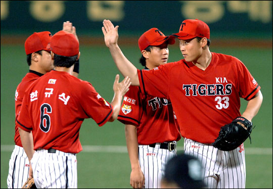 KIA가 판도 변화의 태풍을 일으킬까. 최하위 KIA의 변신이 시작되는 조짐이다. 지난 주말 선두 SK를 상대로 2승 1패를 거두더니 이번 주중 또 다른 강자 삼성을 맞아 2승 1패를 올렸다. 2번 연속 흑자 시리즈를 펼치고 있다. 아직은 갈 길이 멀다. 24승2무33패로 1위 두산에는 8경기차, 4위 삼성에는 4.5경기차, 7위 롯데에는 3.5경기차로 뒤져 있다. 5월 하순부터 워낙 까먹은 통에 따라잡기가 쉽지 않다. 그러나 다른 팀들은 KIA에 대해 경계감을 보이고 있다. KIA가 그냥 꼴찌에 머무르지는 않을 것이라는 전망도 나오고 있다. 따라서 KIA가 본격적인 반격에 나선다면 치열한 경쟁구도를 뒤흔드는 진앙지가 될 것으로 보인다. 다들 달라진 눈으로 바라보는 이유는 팀의 체질이 바뀌고 있기 때문이다. 불안하던 마운드가 안정감을 되찾고 있고 부실했던 타선도 활기를 띠고 있다. 우선 김진우가 가세한 선발진의 힘이 몰라보게 달라졌다. 김진우는 14일 대구 삼성전에서 6⅔이닝 4실점으로 두 경기 만에 첫 승을 따냈다. 김진우의 승리와 함께 윤석민 스코비 신용운까지 막강한 4선발 체제가 들어섰다. 5선발인 신인 오준형의 활약에 관계없이 이런 선발 로테이션을 가동한다면 승수사냥과 함께 반격의 힘을 얻을 것으로 보인다. 정원-로드리게스의 미들맨과 소방수 한기주 라인도 힘도 어느 구단 못지 않다. 타선도 변화하고 있다. 3할타자 장성호와 이현곤이 중심을 잡고 있는 가운데 4년차 루키나 다름없는 김주형이 연일 홈런포를 날리고 있고 손지환도 덩달아 결정타를 양산하고 있다. 여기에 김경진과 권윤민 김연훈 등도 반짝이는 활약을 보태고 있다. 신예들과 후보들이 대거 등장한 타선이 활기를 띠면서 팀 분위기도 역동적으로 바뀌고 있다. 사실 이들의 활약이 지속될지는 아직은 장담할 수는 없다. 전체적인 수비라인도 헐거워지는 약점도 생겼다. 그러나 적어도 패배감으로 인해 무력했던 타선이 아니다. 뭔가 해보자는 분위기가 형성되고 있고 경쟁의식도 꿈틀거린다. 새로운 힘이 생기고 있는 것이다. KIA는 6월에서 승패 적자폭을 최대한 줄여야 되는 화두를 안고 있다. 서정환 감독도 적자를 4~5까지 줄여놓아야 7~8월 대반격의 실마리를 잡을 수 있을 것으로 판단하고 있다. 힘을 되찾고 있는 KIA가 순위경쟁의 태풍의 눈으로 떠오르게 될지 주목된다. sunny@osen.co.kr KIA 타이거즈 제공.