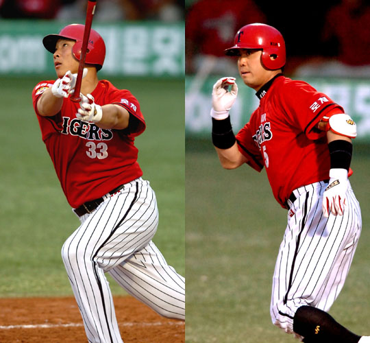 드디어 비상의 기회를 잡았다. KIA 내야수 손지환(29)과 김주형(22)이 KIA 타선에 힘을 불어넣고 있다. 김주형은 본격 출전한 6월 들어 30타수 10안타 4홈런 8타점을 기록하고 있다. 최근 7경기연속 안타 행진도 벌이고 있다. 손지환은 6월 들어 2할1푼3리에 불과하지만 최근 몰아치기를 하고 있다. 지난 9일 광주 SK전에서 3점홈런 포함 4타점으로 승리를 이끌었고 13일과 14일 대구 삼성전에서도 2홈런 8타점을 기록했다. 한때 눈치만 보기 급급했던 후보들의 얼굴이 아니다. 이들은 한때 서정환 KIA 감독이 기대했던 회심의 카드였다. 서 감독은 지난해 준플레이오프에서 탈락한 뒤 2007시즌 팀 공격력 강화를 위한 키포인트로 손지환과 김주형을 점찍었다. 두 선수가 공격과 수비에서 성장한다면 팀의 체질이 바뀔 것으로 보았기 때문이다. 손지환은 주전 2루수, 김주형은 주전 3루수로 기용하고 이현곤을 유격수로 배치하는 청사진이 설계됐다. 지난해 가을캠프부터 지난 2월 미야자키 스프링캠프까지 두 선수는 집중 조련을 받았다. 올해로 11년째를 맞는 손지환은 그런 대로 타격 재능은 갖췄지만 수비력이 문제였다. 송구가 정확하지 않은 데다 수비범위, 센스, 글러브질 등이 문제였다. 동성고 출신 김주형은 KIA 타선의 미래를 짊어진 유망주로 평가받았지만 입단 이후에는 좀처럼 성장하는 모습을 보여주지 못했다. 비로소 지난해 가을 서 감독의 낙점을 받고 가을캠프부터 지옥훈련을 시작했다. 수비와 타격을 모두 끌어올리는 힘겨운 작업이었다. 미야자키에서도 연일 특타와 특수가 이어졌다. 그러나 시범경기를 통해 불합격 판정을 받았다. 타격 성취도가 낮고 근성이 없다는 혹평을 받았다. 물론 수비력도 나아지지 않았다는 평가도 뒤따랐다. 주전 경쟁에서 밀려났다. 결과적으로 서 감독이 올 시즌 회심의 카드로 사용하려던 손지환-김주형은 실패로 귀결되는 듯했다. 그런데 팀이 최하위에 허우적거리고 김종국과 이재주의 2군행, 최희섭 홍세완 김원섭의 부상과 함께 기회가 주어졌다. 물론 아직은 수비력이 불안하지만 타격에서 인상적인 활약을 펼쳤다. 화끈한 타격으로 팀의 메마른 공격력을 해갈시켜주고 있다. 14일 대구 삼성전에서는 나란히 연타석홈런으로 11타점을 합작했다. 손지환은 프로야구 최초로 무보살 삼중살의 주인공이 되기도 했고 김주형은 1루수를 맡으면서 타격도 활기를 띠고 있다. 이제 호랑이 팬들은 기회를 잡은 두 선수가 KIA의 대반격을 이끌어 주기를 기대하기 시작하고 있다. sunny@osen.co,kr 김주형-손지환=KIA 타이거즈 제공.