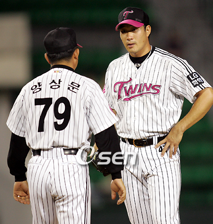 '2007 삼성PAVV 프로야구' LG 트윈스와 KIA 타이거즈의 경기가 15일 잠실야구장에서 열렸다. LG의 선발 봉중근이 6회 2실점해 10-3인 상황서 2사 1, 3루가 되자 양상문 투수코치가 나와 강판시키고 있다. 경헌호가 마운드를 넘겨 받아 이종범을 삼진으로 잡고 추가 실점 없이 이닝을 끝냈다./잠실=황세준 기자 storkjoon@osen.co.kr