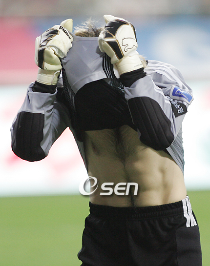 FC 서울과 인천 유나이티드의 삼성 하우젠컵 2007 플레이오프 4강전이 20일 저녁 서울 상암 월드컵구장에서 벌어졌다. 연장전까지 가는 접전 끝에 1-1로 승부를 가리지 못하고 승부차기에서 서울의 골키퍼 김병지가 인천의 마지막 키커 이동원의 킥을 막아낸 뒤 환호하며 유니폼 상의를 걷어 올리고 있다. /상암=황세준 기자 storkjoon@osen.cokr