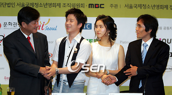 내달 19일부터 24일까지 6일간 열리는 '제9회 서울국제청소년 영화제' 공식 기자회견이 26일 서울 중구 세종호텔에 열렸다. 청소년 영화 문화 발전을 위해 노력하고 참여하는 청소년들에게 희망을 지지해주는 역할을 맡은 'SIYFF 지킴이' 김혜성 신세경, 이용관 조직위원장, 김종현 집행위원장(왼쪽부터)이 서로 손을 잡고 포토타임을 갖고 있다./황세준 기자 storkjoon@osen.co.kr