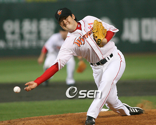 2007 프로야구 SK 와이번스와 롯데 자이언츠의 경기가 26일 인천 문학야구장에서 벌어져 SK가 선발 전원 안타를 기록하며 9-4로 승리했다. 롯데의 전국구 에이스 손민한은 2이닝을 마치지 못하고 6실점하며 2회말 투아웃에서 마운드를 내려갔다. 9회초 무사 1,2루서 구원 등판, 무실점으로 막은 정대현이 힘차게 공을 뿌리고 있다./인천=손용호 기자spjj@osen.co.kr