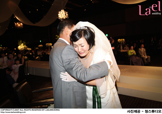 마당발 연예인 박경림(29)이 행복이 가득한 결혼식을 올렸다. 한 살 연하의 신랑 박정훈 씨를 작년 여름 처음 만나 1년여의 교제 끝에 15일 낮 서울 중구 장충동 신라호텔 다이너스티홀에서 사랑의 결실을 맺었다. 박경림이 양가 부모 인사에서 아버지를 끌어 안고 기자회견에 이어 또 눈물을 흘리고 있다. 이날 결혼식은 언론에는 비공개로 치러졌고 결혼식장 내부 사진은 소속사인 팬텀엔터테인먼트를 통해 일괄적으로 공개됐다. /라엘웨딩 제공.