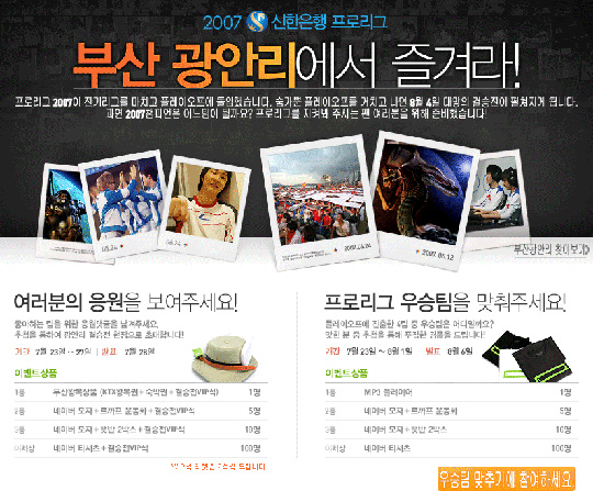 한국e스포츠협회와 인터넷 포털 네이버가 '신한은행 프로리그 2007' 전기리그 광안리 결승전 특별 이벤트를 진행한다. 한국e스포츠협회는 23일 네이버와 함께 2007년 e스포츠 최대 행사인 신한은행 프로리그 2007 전기리그 광안리 결승전 특별 이벤트를 개최할 예정이라고 밝혔다. 23일부터 27일까지 진행되는 "여러분의 응원을 보여주세요~" 전기리그 광안리 결승전 이벤트는 좋아하는 팀을 위한 응원 댓글을 남기면 추첨을 통해 직접 광안리로 응원갈 수 있는 풀 패키지(KTX왕복권+숙박권+결승전 VIP티켓)를 받아 2007년 여름 최고의 추억을 만들 수 있는 기회를 제공 한다. 이번 광안리 결승전 이벤트에 참가하는 팬들에게는 추첨을 통해 광안리 왕복 패키지, MP3플레이어, 르까프 운동화, 햇반 그리고 특별히 네이버에서 제공하는 T셔츠와 모자를 선사할 계획이다. 또 오는 8월 1일까지 진행되는 "우승팀을 맞혀주세요~" 이벤트에 참가, 포스트시즌에 진출한 4팀 중 우승팀을 맞추면 추첨을 통해 MP3플레이어, 네이버 모자, 네이버 티셔츠, 르까프 운동화, 햇반 등 푸짐한 경품을 제공할 예정이다. 한국e스포츠협회 제훈호 이사는 “이번 이벤트를 통해, 2007년 최고 행사인 프로리그 전기리그 결승전을 더 많은 e스포츠 팬들과 함께하고 국내 최고 인기스포츠로서 e스포츠로 성장할 수 있는 계기를 마련할 수 있게 지원을 아끼지 않은, 국내 최대 온라인 포털 네이버에 감사한다.”고 말했다. 이번 이벤트는 한국e스포츠협회 홈페이지(www.e-sports.co.kr)과 네이버 이벤트 페이지(http://news.naver.com/sports/index.nhn?category=general&ctg=event&mod=esports_pro2007_1st)를 통해 참가 가능하다. scrapper@osen.co.kr