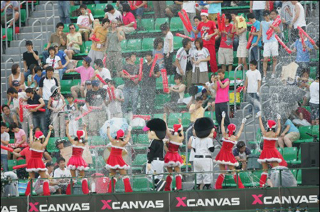 “서머크리스마스로 무더위 날려 버리세요”. '빨간 치어리더'가 돌아왔다. 미니스커트 산타클로스를 보고 싶다면 오는 주말에 잠실야구장을 찾으면 된다. 해마다 여름이면 기다려지는 잠실구장의 명물, LG 트윈스의 '서머 크리스마스' 이벤트가 열린다. 지난 2001년 시작돼 숱한 남성팬들의 '절대 지지' 속에 올해로 7회째를 맞은 '썸머 크리스마스'는 4~5일(토, 일) 두산과의 잠실 홈경기 때 실시된다. 빨간색 산타 복장을 한 치어리더들을 따라 캐럴을 맞춰 공연을 하고, 브라스밴드 ‘스윙킹즈’가 크리스마스캐롤과 신나는 음악으로 잠시나마 무더위를 잊을 기회를 제공한다. LG는 올해 서머크리스마스 행사에 구세군 자선냄비, 눈사람 모형, 스노 스프레이, 산타 복장 치어리더와의 즉석 사진 촬영 등 겨울분위기를 연출할 수 있는 다양한 이벤트를 준비했다. 또한 크리스마스 분위기를 고조시키기 위해 관중들에게 스프레이와 스파클러 불꽃 등 다양한 응원기구도 증정하며 어린이관객 1천명에게 완구업체 ㈜손오공에서 제공하는 장난감과 인형등도 무료로 나눠줄 계획이다. sun@osen.co.kr 산타 복장을 한 치어리더들=LG 트윈스 제공