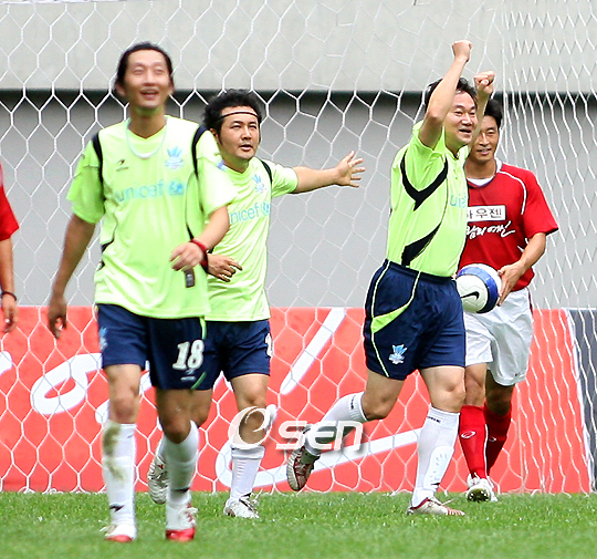 하우젠 K-리그 올스타 2007 경기가 서울 수원 전북 성남 대구 인천으로 이루어진 중부올스타와 경남 울산 전남 제주 부산 포항 광주로 구성된 남부올스타로 나뉘어 4일 오후 서울 상암월드컵경기장에서 벌어졌다. 오픈게임으로 열린 프로축구 역대 득점왕으로 구성된 황금발 클럽과 연예인 올스타의 경기서 연예인 팀의 배도환이 추격에 불을 당기는 팀의 두 번째 골을 넣고 환호하고 있다./상암=손용호 기자spjj@osen.co.kr