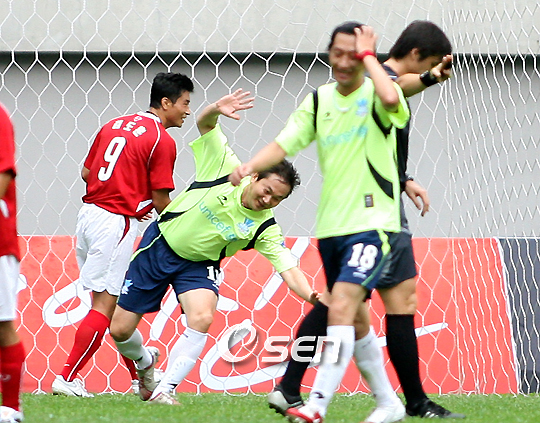 하우젠 K-리그 올스타 2007 경기가 서울 수원 전북 성남 대구 인천으로 이루어진 중부올스타와 경남 울산 전남 제주 부산 포항 광주로 구성된 남부올스타로 나뉘어 4일 오후 서울 상암월드컵경기장에서 벌어졌다. 오픈게임으로 열린 프로축구 역대 득점왕으로 구성된 황금발 클럽과 연예인 올스타의 경기서 연예인팀의 배도환이 팀의 두 번째 골을 넣고 텀블링을 하고 있다./상암=손용호 기자spjj@osen.co.kr