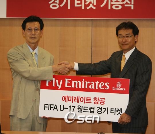 에미레이트 항공이 FIFA U-17 월드컵을 후원한다. 에미레이트 항공은 6일 이상진 한국지사장, 한국 유소년 축구연맹 김휘 회장 등이 참석한 가운데 FIFA U-17 경기 티켓 1000장과 단체 응원 티셔츠를 한국 유소년 축구연맹에 기증했다. 전국 초등학교 축구 클럽을 육성하고 있는 한국 유소년 축구연맹은 미래 축구 주역들에게 전세계 24개국 선수들이 각축을 벌일 FIFA U-17 월드컵 경기 관람 기회를 폭넓게 전달할 예정이다. FIFA U-17 월드컵은 오는 18일부터 9월 9일까지 전국 8개 도시에서 개최된다. 한국은 페루, 코스타리카, 토고와 함께 A조에서 경기를 치르게 된다. 에미레이트 항공은 지난 1987년부터 스포츠 스폰서십을 시작하여 항공사 최초로 2006 FIFA 월드컵 후원사를 하는 등 적극적인 스포츠마케팅을 펼치고 있다. bbadagun@osen.co.kr