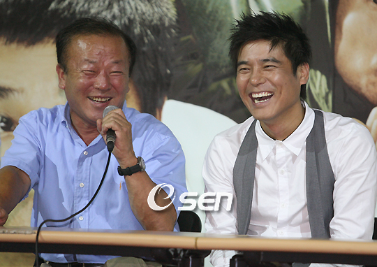 대한민국 코믹연기의 지존으로 불리는 임현식 김수미 임창정 박진희 류승범 이한위가 출연하는 영화 '만남의 광장' 제작발표회가 7일 신촌 메가박스에서 열렸다. 38선이 설치되면서 남과 북으로 갈린 한마을 가족들과 이 동네로 부임한 선생이 벌이는 사건을 그린 코믹 영화다. 임현식이 애드리브와 관련된 얘기를 하다 "웃기는 장면일수록 진지하게 연기를 했다"고 밝히자 옆에 있던 임창정이 웃고 있다./손용호 기자spjj@osen.co.kr