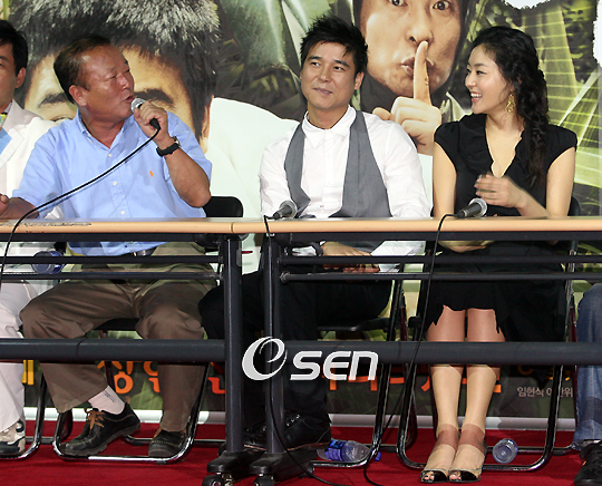 대한민국 코믹연기의 지존으로 불리는 임현식 김수미 임창정 박진희 류승범 이한위가 출연하는 영화 '만남의 광장' 제작발표회가 7일 신촌 메가박스에서 열렸다. 38선이 설치되면서 남과 북으로 갈린 한마을 가족들과 이 동네로 부임한 선생이 벌이는 사건을 그린 코믹 영화다. 임현식이 영화에서 처제 박진희를 덮치는 것으로 오해 받는 장면을 두고 "진희의 터질듯한 몸매에 어찌할 줄 모르고 있는데 결혼도 안한 총각 감독이 잘 해결해 줬다"며 박진희를 쳐다보며 웃고 있다./손용호 기자spjj@osen.co.kr