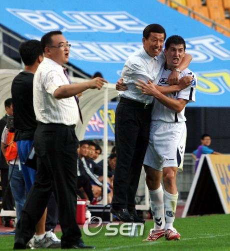 전북 현대가 수원 삼성에 승리를 거두며 후반기 K리그를 기분 좋게 출발했다. '강희대제' 최강희 감독이 이끄는 전북은 8일 수원 월드컵경기장서 벌어진 원정 경기서 2골을 몰아친 스테보와 빠른 돌파를 보여준 정경호-정종관의 활약에 힘입어 수원 삼성에 3-2로 이겼다. 이로써 정규리그 5위를 달리고 있던 전북은 승점 3을 추가했고 지난해 5월 이후 수원전 6경기 무패 기록을 이어갔다. 이날 경기는 미드필드진에서 앞서는 수원이 압박을 통해 주도권을 잡았다. 그렇지만 수원은 잦은 패스 미스를 범해 전방으로 볼이 제대로 연결되지 못했다. 선제골은 전북이 뽑았다. 전반 11분 울산에서 이적해온 정경호가 수원의 왼쪽을 돌파한 후 골문 앞에 있던 스테보에 연결했다. 스테보는 이를 침착한 슈팅으로 득점에 성공, 귀중한 선취골을 뽑아냈다. 첫 실점 후 수원은 더욱 강하게 전북을 몰아쳤다. 하지만 번번이 문전에서 전북의 수비에 걸리며 골을 만들어내지 못했다. 하지만 계속적인 공세를 펼치던 수원은 전반 23분 만회골을 터트렸다. 송종국의 공간 패스를 받은 배기종이 아크 정면에 있던 에두에게 크로스를 올렸고 에두는 이 크로스를 그대로 강한 오른발 발리슈팅으로 연결해 전북의 골네트를 흔들어 경기를 원점으로 돌렸다. 1-1로 동점을 이룬 후 양 팀은 적극적으로 공세에 나서며 추가 득점을 위해 노력했다. 추가골이 터진것은 전반 41분이었다. 전북의 정종관이 수원의 오른쪽 진영을 돌파한 후 양상민을 앞에 두고 화려한 발재간으로 완전히 제친 뒤 반대쪽 골대를 보고 왼발 슈팅을 성공시켜 2-1로 앞서며 전반을 마무리 했다. 후반 들어 홍순학과 김대의를 투입하며 첫 번째 승부수를 띄운 수원은 전북과 난타전을 벌였다. 수원은 후반 18분 전북의 오른쪽을 돌파한 에두가 반대쪽으로 크로스를 올렸고 이를 백지훈이 강력한 슈팅으로 득점에 성공하며 2-2 동점을 만들었다. 그러나 동점골의 기쁨도 잠시였다. 실점 후 전북은 휘슬이 울리자마자 정종관이 수원의 오른쪽을 돌파한 후 낮은 크로스를 문전으로 보냈고 이를 스테보가 침착하게 골로 연결해 3-2로 다시 앞서 나갔다. 수원의 차범근 감독은 후반 26분 전북의 수비진을 흔들어 놓을 수 있는 안정환을 투입하며 두 번째 승부수를 던졌다. 이후 안정환은 전북의 포백라인을 적극 공략하며 전방 침투까지는 성공했으나 득점에는 실패했고 결국 전북이 승리를 거두었다. 10bird@osen.co.kr 전반 스테보가 선제골을 넣은 뒤 펄쩍 뛰는 최강희 감독과 얼싸안고 있다./수원=우충원 기자 10bird@osen.co.kr