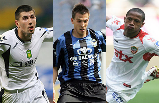 '까보레, 게 섯거라!'. 여름 휴식기를 마치고 지난 8일 재개된 K리그 7경기서 20골이 터지면서 그 동안 숨죽이고 있던 킬러들이 본능을 드러내 앞으로 치열한 득점 레이스가 펼쳐질 것임을 예고했다. 이날 스테보(전북)와 데얀(인천)은 2골씩 뽑아내 정규리그서 나란히 9골을 기록, 이날 골맛을 보지 못한 선두 까보레(경남, 10골)를 한 골 차로 바짝 추격했다. 스테보는 수원과의 경기서 전방에서 홀로 공격을 이끌었다. 정경호-정종관의 크로스를 침착하게 슈팅으로 연결하는 모습을 보인 스테보는 부상으로 빠진 제칼로의 몫까지 커버했다. 전북 최강희 감독은 스테보에 대해 "크로스나 코너킥 상황에서 수비 사이를 빠져 나가는 모습 만큼은 특급선수"라며 그를 크게 칭찬했다. 또 데얀은 대구 루이지뉴와의 대결에서 완승을 거뒀다. 데얀은 이날 경기서 기습적인 슈팅과 수비 뒷 공간을 돌아 들어가는 능력을 과시하며 2골을 뽑아냈다. 특히 돌아가면서 자신을 마크한 대구의 조홍규 윤여산 김현수 등을 완전히 따돌려 전반기에 이어 후반기서도 인천의 공격 핵으로 한 몫을 톡톡히 하면서 골 사냥에 나설 전망이다. 10bird@osen.co.kr 스테보-데얀-까보레.