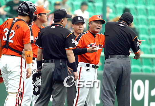 2007 프로야구 문학 홈구장에서 3연패를 기록중인 레이번과 SK전 3연패를 기록중인 정민철이 선발로 맞붙어 관심을 끈 SK 와이번스와 한화 이글스의 경기가 11일 인천 문학야구장에서 벌어졌다. 2회말 무사 이호준의 타구를 한화 유격수 김민재가 노바운드로 잡아 아웃이라며 유지훤 코치가 박기택 1루심에게 항의하고 있다. 판정은 원바운드로 인정 유격수 실책이 됐다./인천=손용호 기자spjj@osen.co.kr