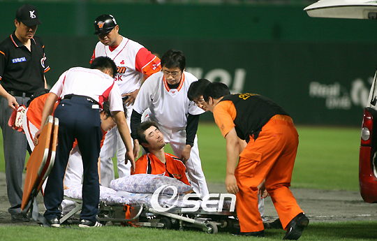 2007 프로야구 문학 홈구장에서 3연패를 기록중인 레이번과 SK전 3연패를 기록중인 정민철이 선발로 맞붙어 관심을 끈 SK 와이번스와 한화 이글스의 경기가 11일 인천 문학야구장에서 벌어졌다. 9회말 무사 2루 SK 김강민과 충돌해 부상을 당한 한화 한상훈이 앰블런스에 실려 병원으로 이송되고 있다. 한상훈은 1루에서 투수 안영명의 송구를 받다 타자주자인 김강민과 충돌 부상을 당했다./인천=손용호 기자spjj@osen.co.kr