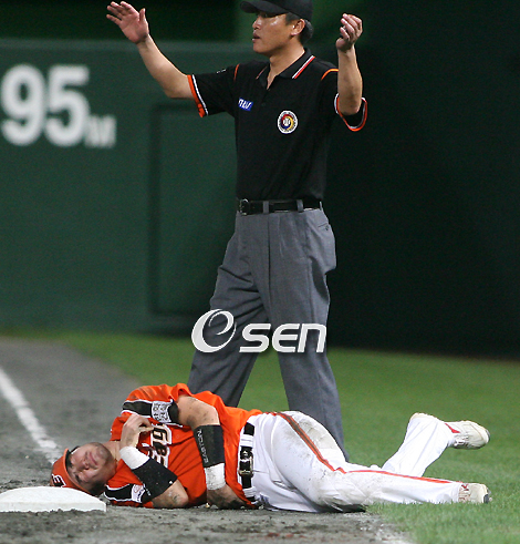 2007 프로야구 문학 홈구장에서 3연패를 기록중인 레이번과 SK전 3연패를 기록중인 정민철이 선발로 맞붙어 관심을 끈 SK 와이번스와 한화 이글스의 경기가 11일 인천 문학야구장에서 벌어졌다. 9회말 무사 2루 SK 김강민과 충돌해 부상을 당한 한화 한상훈이 쓰러져 괴로워 하고 있다. 한상훈은 1루에서 투수 안영명의 송구를 받다 타자주자인 김강민과 충돌 부상을 당해 병원으로 이송됐다./인천=손용호 기자spjj@osen.co.kr