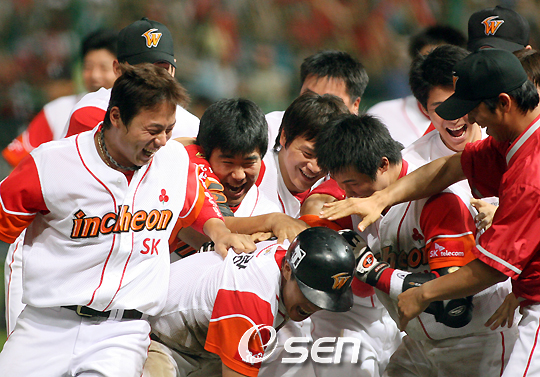 2007 프로야구 문학 홈구장에서 3연패를 기록중인 레이번과 SK전 3연패를 기록중인 정민철이 선발로 맞붙어 관심을 끈 SK 와이번스와 한화 이글스의 경기가 11일 인천 문학야구장에서 벌어졌다. 10회말 1사 1루 정경배의 안타때 3루까지 진루한 정근우가 공을 잡은 한화 좌익수 김인철이 머뭇 거리는 사이 홈을 파고들어 경기를 끝내고 동료들의 축하를 받고 있다./인천=손용호 기자spjj@osen.co.kr