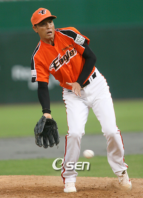2007 프로야구 문학 홈구장에서 3연패를 기록중인 레이번과 SK전 3연패를 기록중인 정민철이 선발로 맞붙어 관심을 끈 SK 와이번스와 한화 이글스의 경기가 11일 인천 문학야구장에서 벌어져 SK가 10회말 정근우의 재치있는 플레이로 4-3으로 한화에 역전승을 거두었다.7회말 1사 이재원의 투수 강습타구를 송진우가 잡아내고 있다. 하지만 송진우는 이 타구를 2루에 악송구 위기를 자초했다./인천=손용호 기자spjj@osen.co.kr