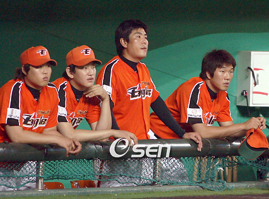2007 프로야구 문학 홈구장에서 3연패를 기록중인 레이번과 SK전 3연패를 기록중인 정민철이 선발로 맞붙어 관심을 끈 SK 와이번스와 한화 이글스의 경기가 11일 인천 문학야구장에서 벌어져 SK가 10회말 정근우의 재치있는 플레이로 4-3으로 한화에 역전승을 거두었다. 9회말 야수들의 어이없는 플레이로 3-3 동점이 되자 덕아웃에 있던 정민철이 아쉬운 표정을 짓고 있다. 정민철은 6⅓이닝을 2실점 했다./인천=손용호 기자spjj@osen.co.kr