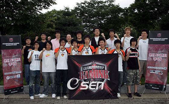 Championship Gaming Series (CGS) 한국 예선전 파이널이 CGS의 CEO 앤디 리프가 직접 참석한 가운데 12일 오후 올림픽공원 펜싱 경기장에서 열렸다. 세계 최초의 프로 비디오게임 리그를 표방하는 CGS는 국내 스타리그와 유사한 방식을 채택했으며 메이저리그 등의 프로스포츠처럼 지역 연고제를 채택한 게 특징이다. CGS에서 뽑힌 선수는 앞으로 미국에서 프로게이머로 활동하게 된다. 선발된 9명의 선수들 외 모든 선수들이 말레이지아에서 열리는 아시아 선발전에 참가한다. 선수들이 기념촬영을 하고 있다. /황세준 기자 storkjoon@osen.co.kr
