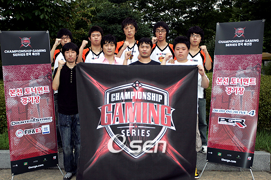 Championship Gaming Series (CGS) 한국 예선전 파이널이 CGS의 CEO 앤디 리프가 직접 참석한 가운데 12일 오후 올림픽공원 펜싱 경기장에서 열렸다. 세계 최초의 프로 비디오게임 리그를 표방하는 CGS는 국내 스타리그와 유사한 방식을 채택했으며 메이저리그 등의 프로스포츠처럼 지역 연고제를 채택한 게 특징이다. CGS에서 뽑힌 선수는 앞으로 미국에서 프로게이머로 활동하게 된다. 선발된 9명의 선수들뿐만 아니라 모든 선수들이 말레이지아에서 아시아 선발전에 참가한다. 최강의 프로게이머들이 한 자리에 모여 기념촬영을 하고 있다. /황세준 기자 storkjoon@osen.co.kr