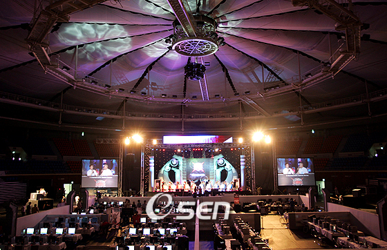 Championship Gaming Series (CGS) 한국 예선전 파이널이 CGS의 CEO 앤디 리프가 직접 참석한 가운데 12일 오후 올림픽공원 펜싱 경기장에서 열렸다. 세계 최초의 프로 비디오게임 리그를 표방하는 CGS는 국내 스타리그와 유사한 방식을 채택했으며 메이저리그 등의 프로스포츠처럼 지역 연고제를 채택한 게 특징이다. CGS에서 뽑힌 선수는 앞으로 미국에서 프로게이머로 활동하게 된다. 사진은 CGS 대회장 전경./황세준 기자 storkjoon@osen.co.kr