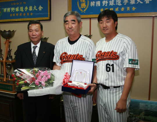 롯데 자이언츠는 14일 사직구장서 강병철 감독의 개인 통산 900승 달성 기념행사를 가졌다. 이 자리서 하영철 롯데 자이언츠 대표이사는 순금 75g(20돈쭝) 상당의 행운의 열쇠와 기념패를 증정했고 선수 대표로 손민한이 축하 꽃다발을 전달했다. 강 감독은 지난 9일 사직 삼성전에서 11-4 승리를 거두며 3연패 탈출과 더불어 통산 900승을 달성했다. what@osen.co.kr 롯데 자이언츠 제공.
