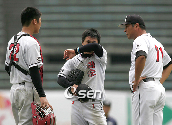 제37회 봉황대기 전국고교 야구대회 순천 효천고와 전남 화순고의 경기가 15일 동대문 운동장에서 벌어져 9회말 주도성의 3타점 싹쓸이 끝내기 안타로 효천고가 짜릿한 4-3 역전승을 거뒀다. 9회말 2사 1,2루서 화순고 이동석 감독이 마운드에 나가 투수 김선빈, 포수 신진호와 이야기를 나누고 있다./동대문=황세준 기자 storkjoon@osen.co.kr