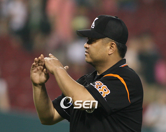 2007 프로야구 두산 베어스와 KIA 타이거즈의 경기가 15일 잠실야구장에서 벌어져 두산이 5-1로 앞서던 7회말 1사 후 비로 중단된 뒤 강우콜드게임이 됐다. 두산 선발투수 리오스는 7이닝 1실점 완투로 15승 고지에 올랐다. 이날 경기를 진행한 심판진의 김풍기 조장이 비가 그친 뒤 운동장 상태가 나빠 경기를 속행하지 못한다며 손으로 제스처를 취하고 있다./잠실=손용호 기자spjj@osen.co.kr