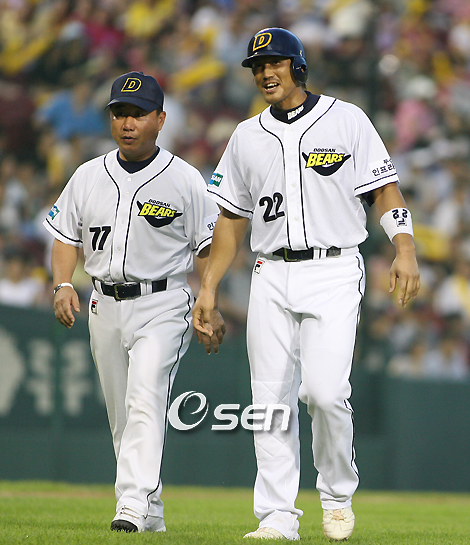 2007 프로야구 두산 베어스와 KIA 타이거즈의 경기가 15일 잠실야구장에서 벌어져 두산이 5-1로 앞서던 7회말 1사 후 내린 비로 강우콜드게임이 됐다. 두산 선발투수 리오스는 7이닝 1실점 완투로 15승 고지에 올랐다. 오랜만에 경기에 출전, 6회말 볼넷을 얻어낸 두산 홍성흔이 이닝이 끝난 뒤 김광수 1루코치와 얘기를 나누며 덕아웃으로 돌아오고 있다./잠실=손용호 기자spjj@osen.co.kr