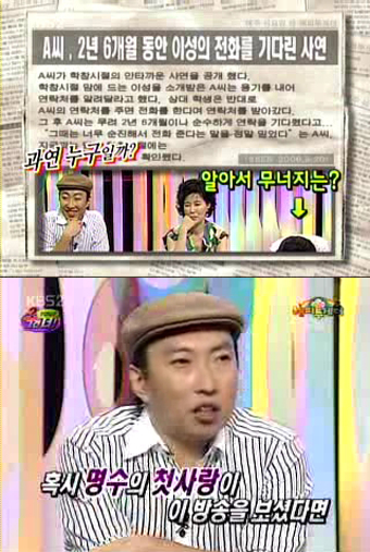거성 박명수(37)가 과거 순수했던 학창 시절의 첫사랑을 공개했다. 16일 방송된 KBS 2TV ‘해피투게더-학교가자’의 한 코너인 ‘그건 너!’에서 ‘A씨, 2년 6개월 동안 이성의 전화를 기다린 사연’이란 기사의 주인공은 의외의 인물 박명수였다. 박명수는 “학창시절에는 굉장히 조용하고 말 한마디 못했다”며 “개그는 후천적으로 개발한 것이다”라고 입을 열었다. “고 3때 연극영화과를 준비하기 위해서 연기학원을 다녔다”며 “학원에서 연기 지망의 여학생을 봤는데 그처럼 예쁜 이를 보지 못했다. 연락처를 줬고 연락을 하겠다고 해서 기다리게 됐다”고 밝혔다. MC 유재석이 그 사람의 이름이나 성을 기억하는지 물었지만 “이름이 기억나지 않는다”고 털어놨다. 또한 이 방송을 보면 연락을 달라는 유재석의 말에 박명수는 “연락하지 말고 잘 살라”며 “나중에 양로원에서 보자”라고 답변해 주위를 웃음바다로 만들었다. 한편, 이날 ‘해피투게더-학교가자’에서는 게스트로 출연한 주영훈을 응원하기 위해 아내 이윤미가 촬영장에 깜짝 방문해 눈길을 끌기도 했다. 주영훈을 포함해 송은이 임예진 솔비 손호영이 게스트로 출연해 시종일관 화기애애한 분위기로 유쾌한 웃음을 안겨줬다. AGB닐슨미디어리서치의 조사에 따르면 16일 ‘해피투게더-학교가자’는 13.0%의 시청률로 동 시간대 시청률 1위를 기록했다. MBC TV ‘지피지기’9.7%, SBS TV ‘헤이헤이헤이 시즌2’는 9.2%의 시청률을 기록했다. crystal@osen.co.kr KBS 제공.